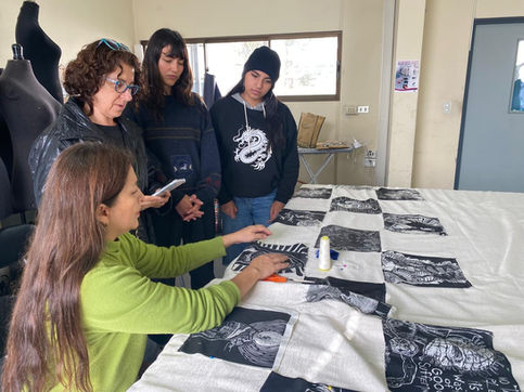 The choir performed a work by Cuban composer Leo Brouwer, which is an ode to creation, with roots in local popular music, once again referencing syncretism as a cultural characteristic of our artistic production. The printmaking students explored free themes printed on fabric and later sewn to the hem of the tunic as borders, generating a graphic and monochromatic visual intervention. The sewing of the prints was carried out at the Design School of the University of Valparaíso, in the facilities of their textile workshops.
